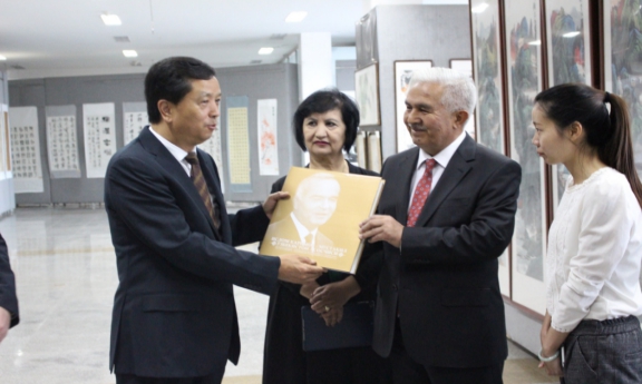 乌兹别克斯坦前文化体育部部长库兹耶夫•图尔苏纳里向伊犁州党委常委、奎屯市市委书记、奎屯-独山子经济技术开发区党工委书记贾伊生赠送《卡里莫夫纪念画册》