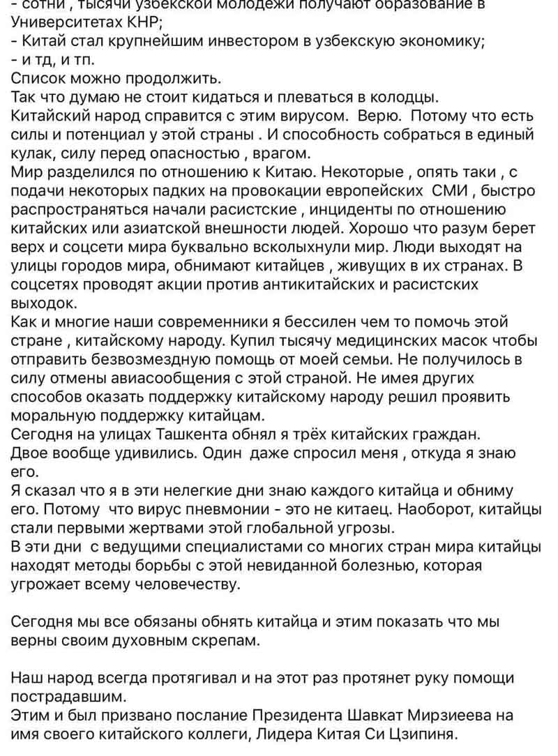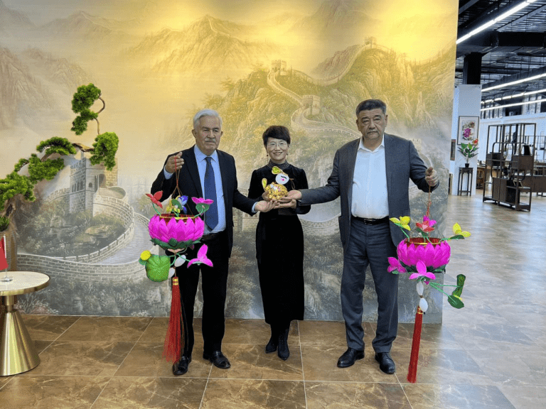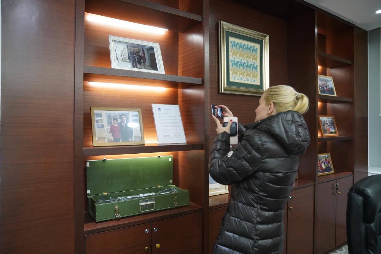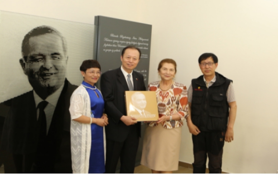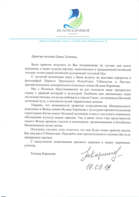 乌兹别克斯坦前文化体育部部长库兹耶夫•图尔苏纳里转交了乌兹别克斯坦前总统夫人卡里莫娃写给新疆亚欧国际物资交易中心有限公司董事长张宏萍女士的亲笔信,对张宏萍女士促进中乌文化交流和经贸发展所付出的努力表示由衷的感谢。